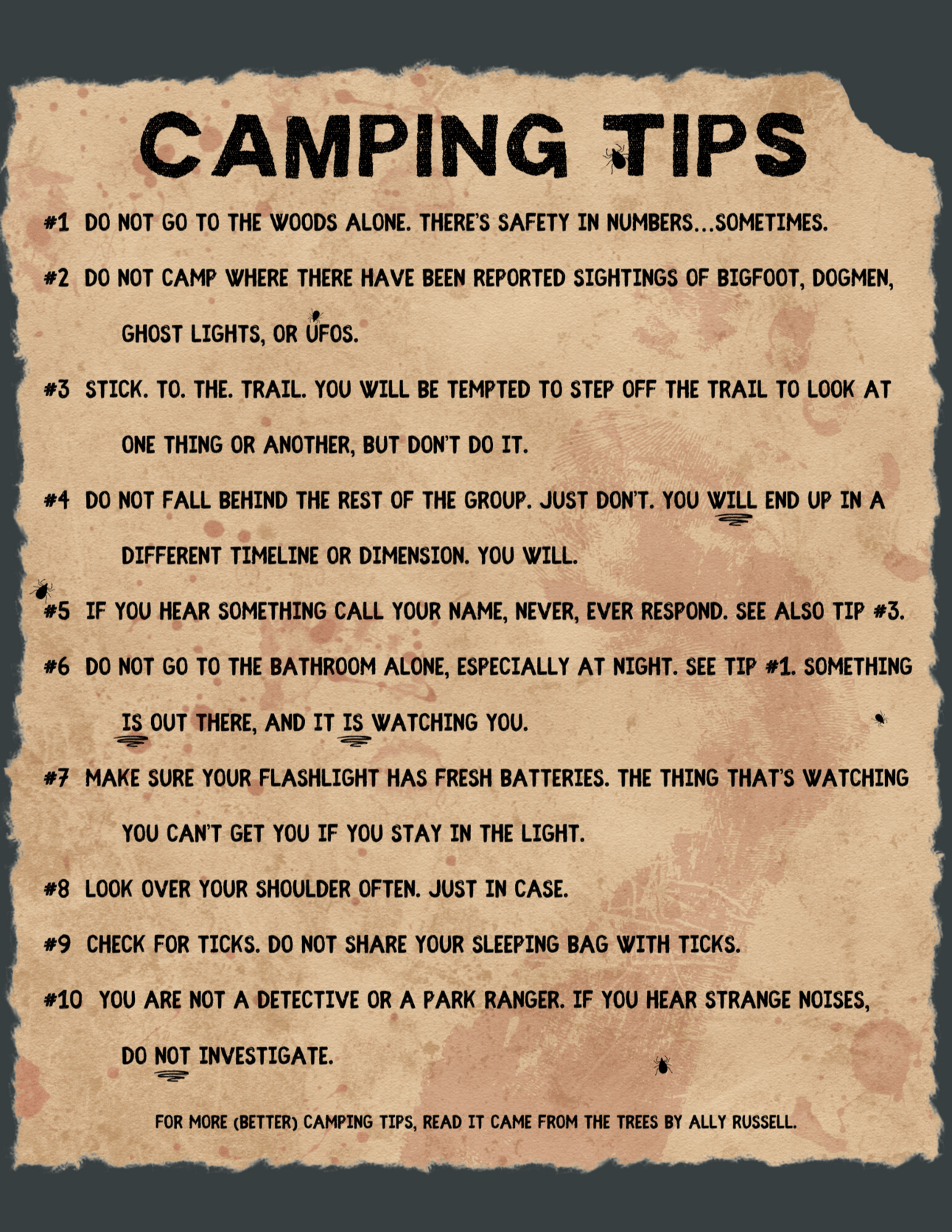 Why? Because the woods are full of creepy crawlies and high strangeness. If you think bigfoot is the scariest thing stalking the woods of the world, you’re wrong. There are other cryptids (like dogman), weird spots where time and space are wonky, and never, ever underestimate the threat of ticks.